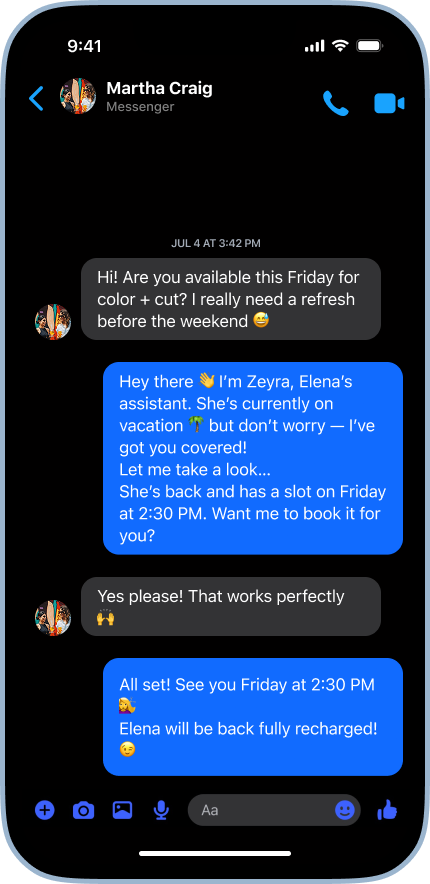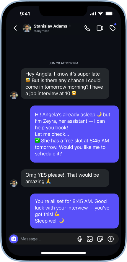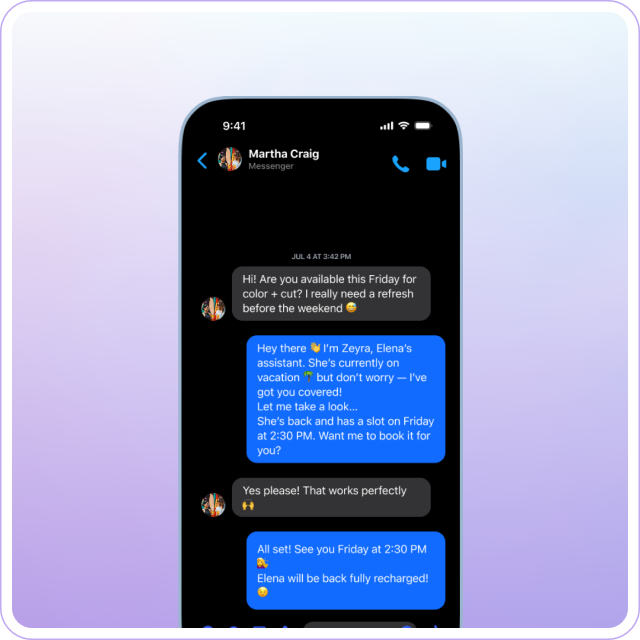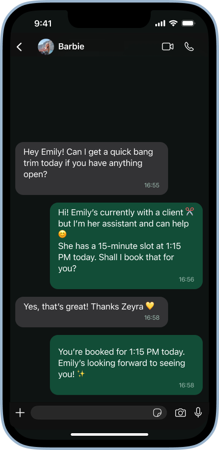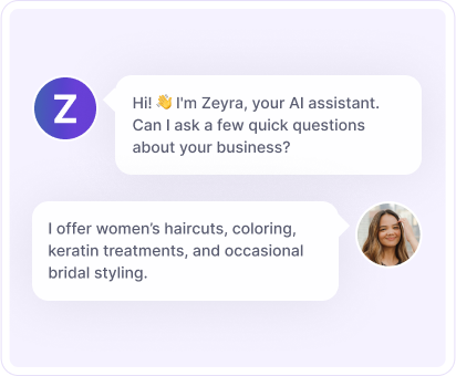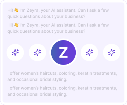Zeyra responds instantly, books smoothly, and keeps your business running even when you’re off the clock.